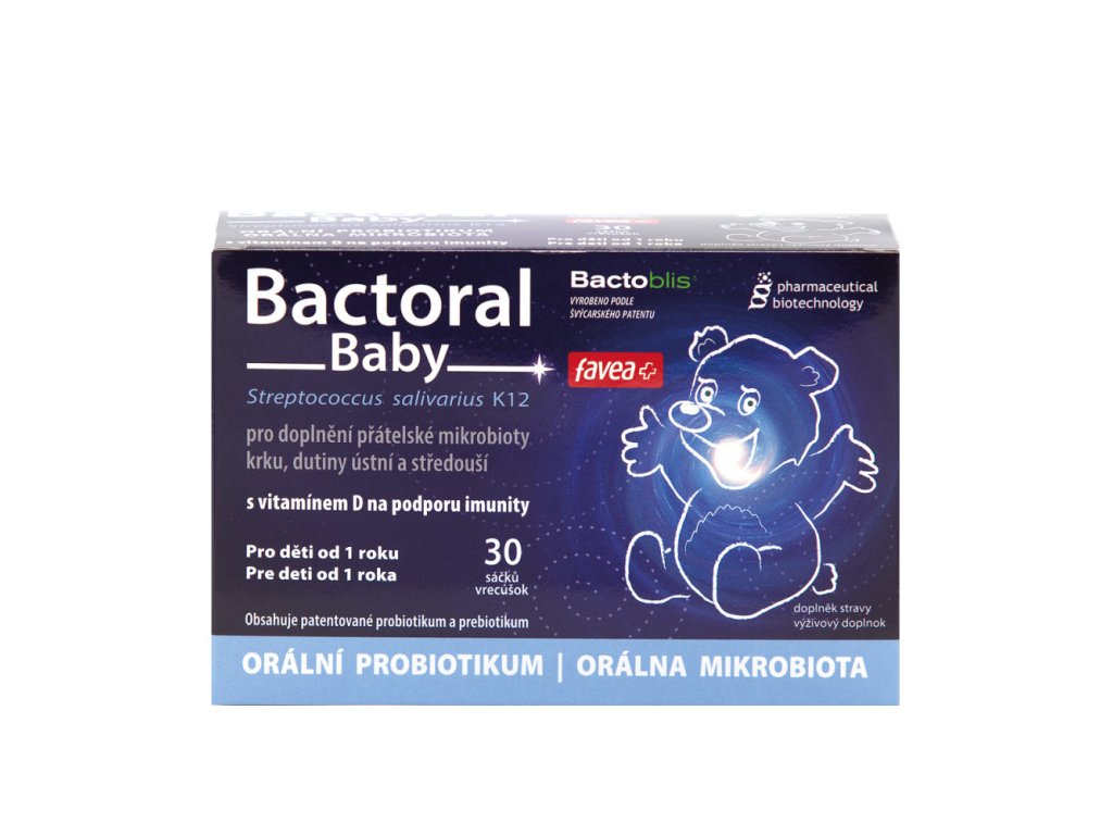 1 sáček 1x denně nejlépe večer po jídle. Odtrhněte svár sáčku na označeném místě a obsah sáčku nasypte do malého množství vlažného mléka nebo jiného nápoje, nejlépe v kojenecké lahvi (teplota nesmí překročit 40°C). Po rozpuštění obsahu umožněte dítěti nápoj pomalu vypít po lžičkách nebo prostřednictvím savičky s menším průtokem, čímž se zajistí vhodný kontakt probiotické kultury se sliznicí. U dětí od 3 let lze obsah sáčku nasypat přímo do úst (Zabraňte vdechnutí!) a nechat volně rozpustit v ústech. Poté alespoň 30 minut nejíst a nepít. Je důležité udržet obsah sáčku co nejdéle v ústech, aby se bakterie Streptococcus salivarius K12 mohla na sliznicích usadit. Pro urychlení kolonizace lze užívat 1 sáček 2x denně po jídle. Bactoral Baby není vhodné kombinovat s antibiotiky. Naopak jej doporučujeme nasadit ihned po dokončení antibiotické léčby s cílem doplnění přátelského mikrobiomu sliznic dutiny ústní. Vždy doporučujeme využívat celé balení. Po té je možné užívání přerušit na cca měsíc a opět kúru opakovat. Před začátkem zimní sezóny a v průběhu zimy (říjen-březen), je možné Bactoral baby užívat dlouhodobě 1 sáček denně bez přerušení.